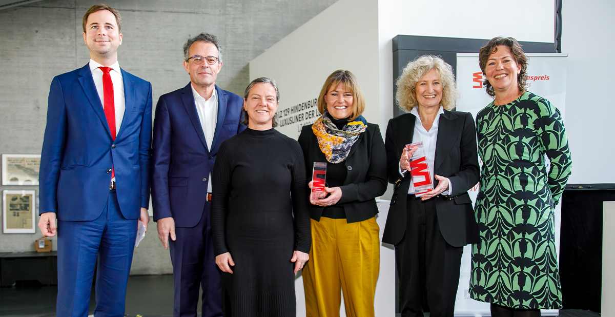 Gewinner Lotto-Museumspreis (v.l.n.r.: Andreas Hein (Bürgermeister Friedrichshafen), Georg Wacker, Anja Kahle (Kulturdezernentin Landkreis Ravensburg), Dr. Tanja Kreutzer (Leiterin Bauernhaus-Museum Allgäu-Oberschwaben), Dr. Claudia Emmert (Leiterin Zepplin Museum Friedrichshafen), Sabine Mücke (Präsidentin Museumsverband BW).